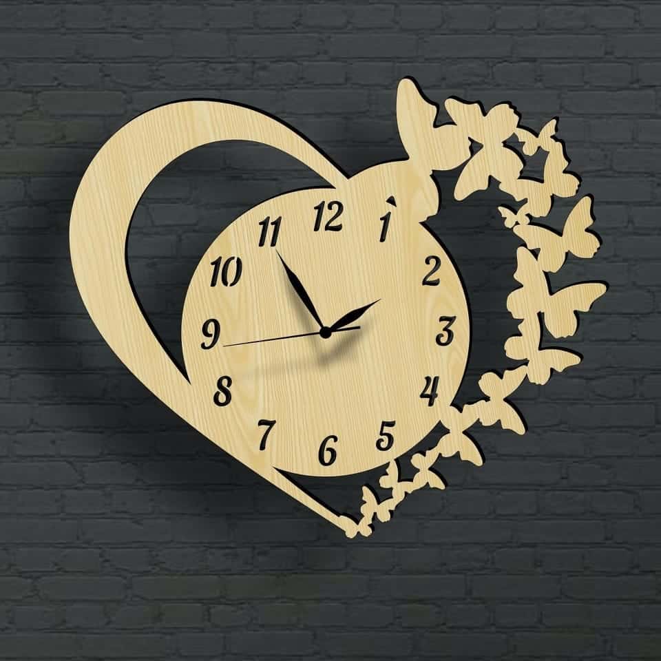 Butterfly Heart Shaped Wooden Wall Clock Laser Cut File Free Download
